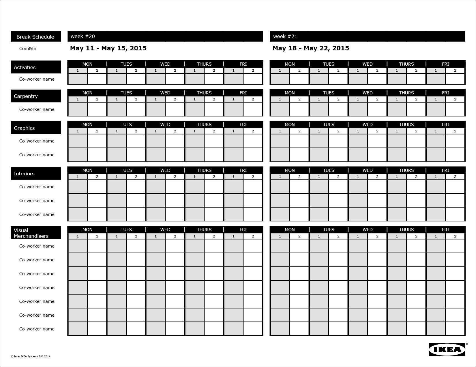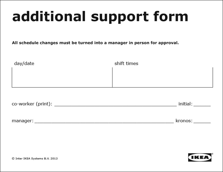 Often times, I was also asked to create tools to help co-workers. A lot of the positions in the store don’t require a computer all day, so having a printed schedule with slips available so co-workers could write down their ever-changing schedules caused a huge boost in attendance across the store. Positions in IKEA Food, Logistics, and even Sales might not even have regular access to a computer, even though they make up a majority of the Co-worker population. These scheduling forms were designed for them.
