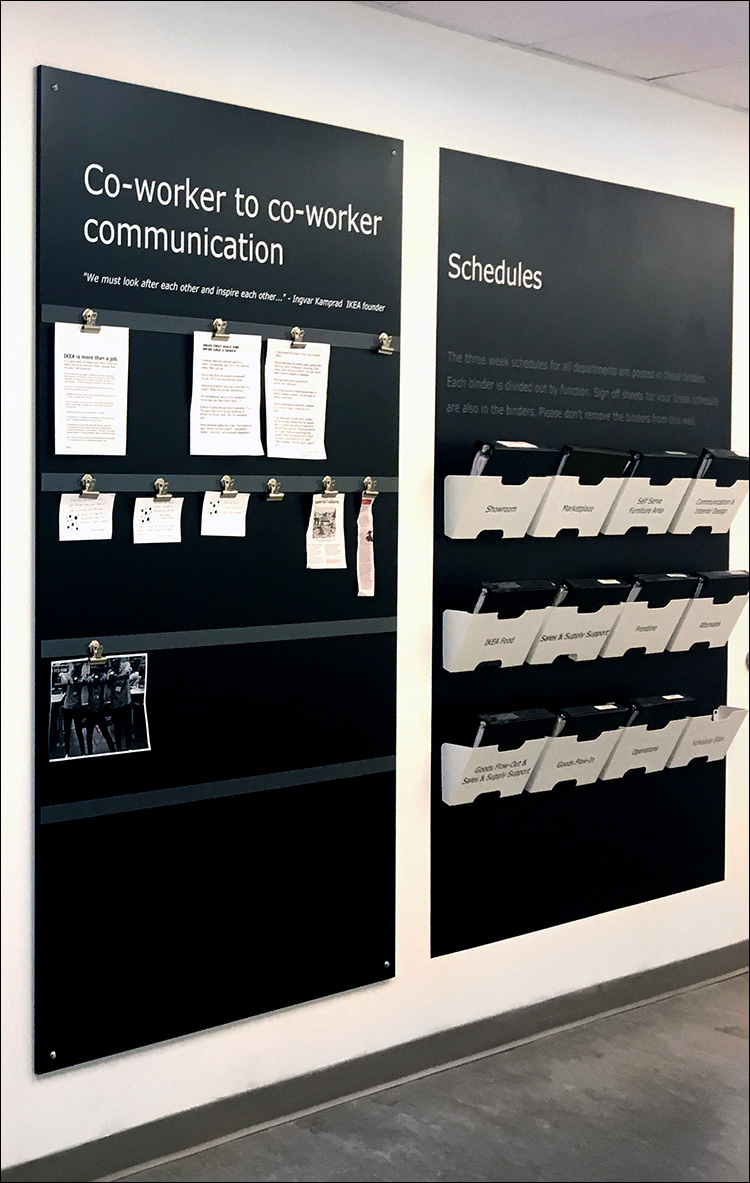 For years, all the various departments handled their scheduling in different ways. But once the Co-workers started getting cross-trained, there was a need to streamline the scheduling across the store. It was decided that all of the departments would be required to print their schedules and have them in a centralized location for all to access. We created a centralized location for all HR/Payroll related items near the Staff Café / Staff Lounge where a majority of co-workers take their breaks. Using the new communication boards, I created a system that utilized letter holders to hold department binders instead of messy magnets for a neater look.