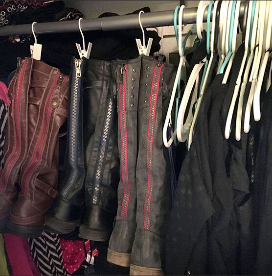 I rushed home to rescue my boots from their precarious storage solution of the boot organizer. I actually don’t have many clothes hanging as I prefer to have them folded. I have a ladder shelf unit that angles back wedged into the closet and thought that I could hang in the boots in front it and just move them out of the way when I needed to access the stuff on the shelves. That worked for like a hot second before I got annoyed with it. To be honest, I installed an adjustable closet rod when I moved in and I just think the clip hooks weren’t the right size to stay on the rod when sliding them out of the way because they kept falling off when you tried to slide them.