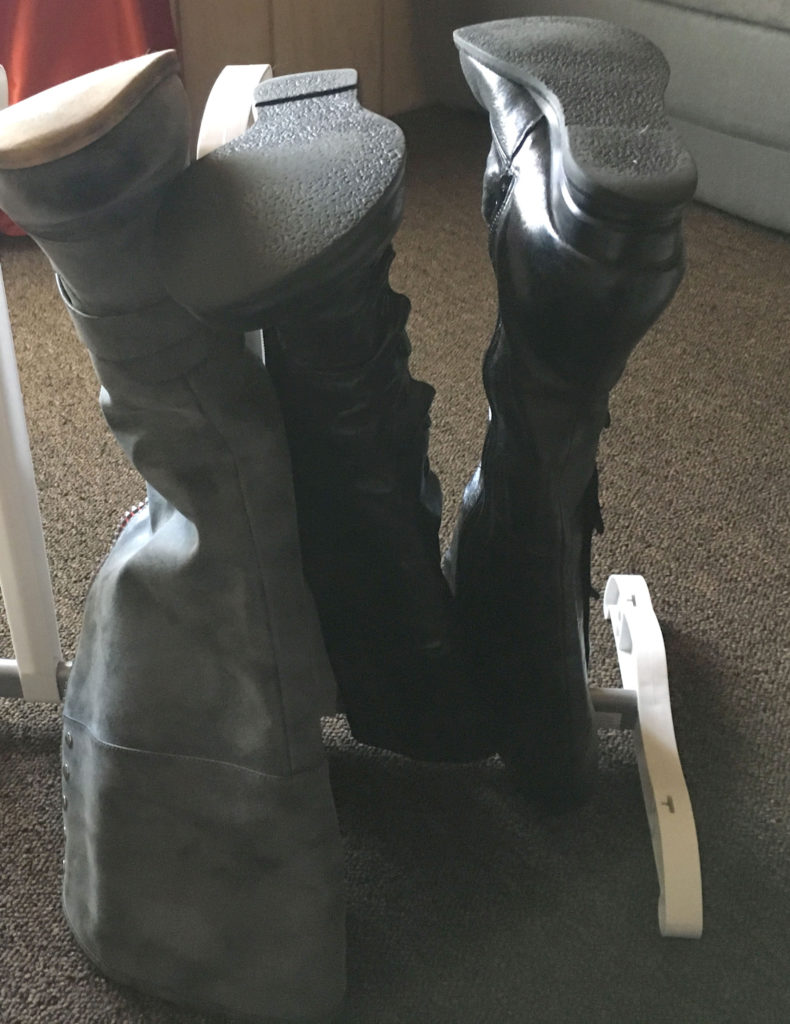 I tried to do what I could to add height to the stand so I could use the organizer. My best attempt was pieces of cardboard taped in stacks and then attached to the stand, which did work… until I finally moved it into the only space I had available in the closet and realized the extra height put the boot soles right up against my few hanging clothes, crumpling up the bottom of my shirts, not to mention possible dirt on the material from the boots. Another fail. Sigh.